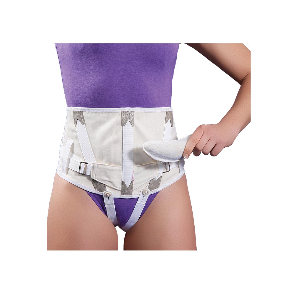 Κατασκευή από διπλό βαμβακερό και υποαλλεργικό ύφασμα. Τρεις μπανέλες στην κοιλιακή χώρα. Μαξιλάρι στήριξης στο υπογάστριο. Ρυθμιζόμενος τριγωνικός ιμάντας με αγκράφες για τη συγκράτηση των κοιλιακών τοιχωμάτων. Οπίσθια ρύθμιση με κορδόνι και πλάγια με κουμπιά ή αυτοκόλλητη επίδεση. Δύο υπομήρια συγκράτησης της ζώνης. Πλένεται.