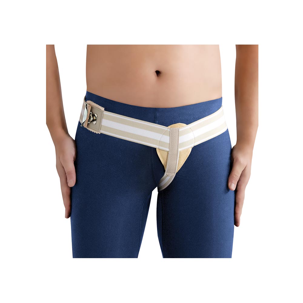 Από ημιελαστική φάσα των 5cm. Πρόσθιο τριγωνικό πλαίσιο με ενσωματωμένη σταθερή και ανατομική πελότα για την υποστήριξη της βουβωνοκήλης. Πλάγιο κλείσιμο με συρταρωτή αγκράφα ασφαλείας. Φέρει υπομήριο με θέσεις εφαρμογής. Πλένεται.