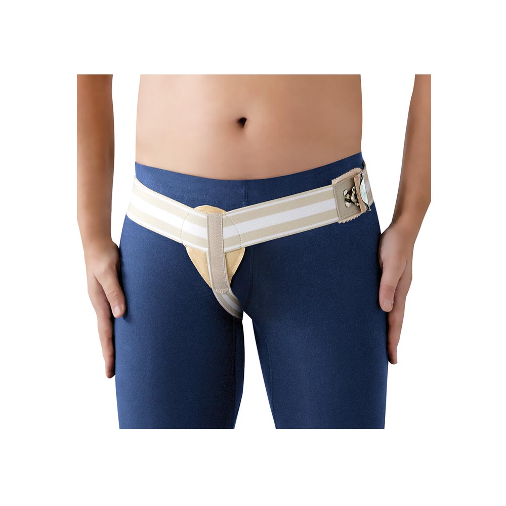 Από ημιελαστική φάσα των 5cm. Πρόσθιο τριγωνικό πλαίσιο με ενσωματωμένη σταθερή και ανατομική πελότα για την υποστήριξη της βουβωνοκήλης. Πλάγιο κλείσιμο με συρταρωτή αγκράφα ασφαλείας. Φέρει υπομήριο με θέσεις εφαρμογής. Πλένεται.